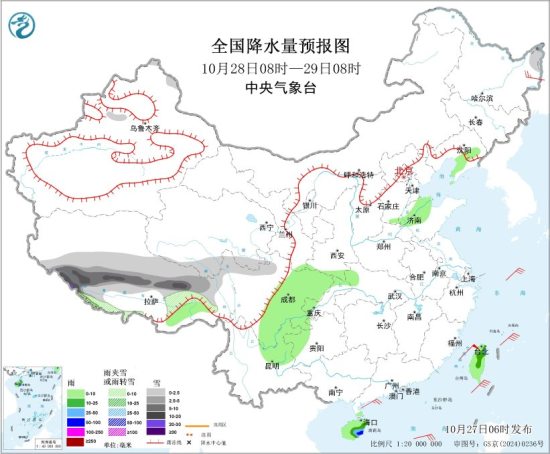 全国降水量预报图(10月27日08时-28日08时)。图片来源:中央气象台网站
