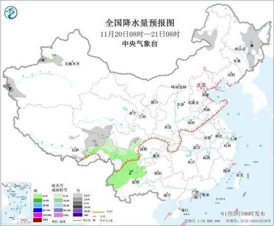 11月20日08时至21日08时,内蒙古东北部、黑龙江东部、吉林东部、新疆伊犁河谷和南疆西部山区、西藏东部、青海西南部、川西高原中部等地部分地区有小雪或雨夹雪,局地有中到大雪(5~9毫米)。西藏东南部、川西高原南部、云南西部和北部等地部分地区有小雨,局地有中雨。内蒙古中东部、西藏西部等地部分地区将有5~6级风、阵风7~8级;南海北部和中部、南海西南部偏西等部分海域将有7~8级风、阵风9~10级。
