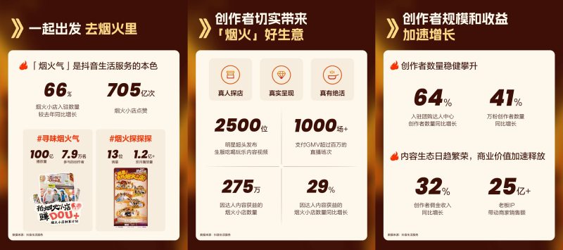 “烟火气”是抖音生活服务的本色,过去一年,创作者发布烟火小店相关视频数量超过13亿,内容创作带动烟火小店POI点击超过287亿次,有超过275万家烟火小店因创作者内容获益。