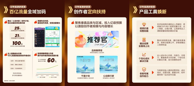二是创作者定向扶持。持续加码千星计划、品类推荐官、心动旅行家等项目,通过现金、流量、商单、变现资源、运营定向陪跑等多种方式,大力扶持具备品类属性/区域属性的优质垂类内容创作者成长。