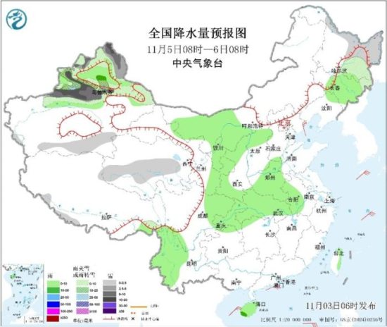 据中央气象台网站消息,11月3日,中央气象台主要关注西南至江南、华南一带的降雨以及海上大风可能带来的影响。此外,11月5日起将有一股较强冷空气自西向东影响我国,公众需关注预报信息。