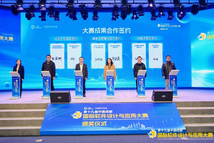 本届大赛落实市委、市政府“立园满园”行动部署,深入天府软件园、白鹭湾科技生态园、西部智谷、西部北斗产业园等园区,开展了系列产业服务推介,通过赛事促进产业主体和资源要素向园区汇聚。同时,链接华为、百度等知名软件企业,电子科技大学信息与软件工程学院等国家级、省级特色化示范性软件学院和成都市“中国软件名城人才基地”以及投融资和金融机构,实现“专业园区+软件企业+知名院校+人才基地+金融机构”融合参与,取得了一批合作成果。通过大赛赋能,已有亚成智芯、启程云志等6家企业入驻西部智谷等园区。现场分两轮完成4个项目签约:开源鸿蒙Py4OH技术生态合作项目链接北京软通动力教育科技有限公司、成都卓物科技有限公司、电子科技大学、西南科技大学、成都信息工程大学、成都理工大学工程技术学院和蜀鸿会7家单位,共建技术创新与人才培养生态;智能厂房建设、企业入驻园区、投融资意向合作三大项目,促成四川徽记食品股份有限公司与中国电子系统工程第三建设有限公司,成都武侯高新技术产业发展股份有限公司与四川启程云志科技有限公司、上海满舵投资管理有限公司与四川拼趣科技有限公司达成深度合作。