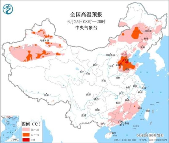 预计今天白天,京津冀、山东中北部、新疆、内蒙古东部、东北地区西部、江东东部、华南中东部等地有35℃以上的高温天气,河北中南部、天津西部、山东中北部、内蒙古东部和新疆南疆盆地等地部分地区最高气温37~39℃,河北中南部、新疆吐鲁番等地局地可达40℃以上。中央气象台今晨继续发布高温黄色预警。