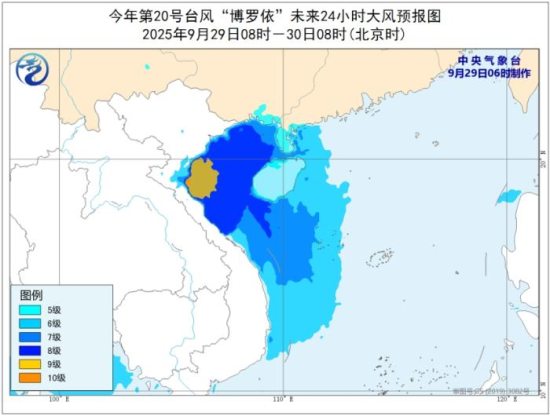 今年第20号台风“博罗依”的中心已于29日1点30分前后在越南河静省沿海登陆,登陆时中心附近最大风力有11级(30米/秒),中心最低气压为980百帕。早晨5点钟“博罗依”的中心位于越南河静省境内,中心附近最大风力有11级(30米/秒),中心最低气压为980百帕,七级风圈半径220~250公里,十级风圈半径60~80公里。预计,“博罗依”将以每小时25~30公里的速度向西偏北方向移动,强度快速减弱。29日08时至30日08时,南海西部、西沙群岛附近海域、北部湾、琼州海峡、广东西部沿海、海南岛及沿海、广西沿海将有6~8级、阵风9~10级的大风,其中,北部湾偏南海域的风力有9~10级、阵风11~12级。中央气象台9月29日6时发布台风蓝色预警。